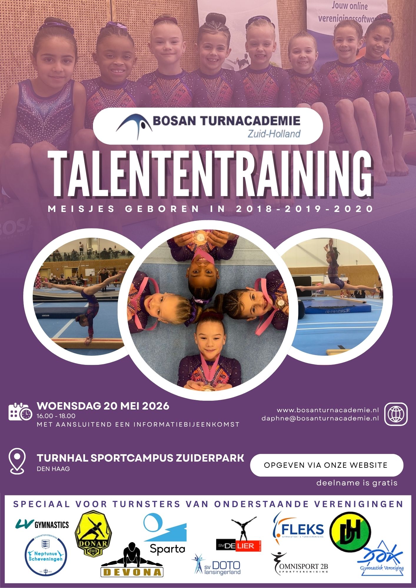 Ben jij lid van een van de onderstaande verenigingen en geboren in 2018-2019-2020? Ben je sterk en lenig? En vind jij het helemaal geweldig om over de kop te gaan? En zou je het liefst meerdere keren per week willen turnen in de mooiste turnhal van de regio?Geef je dan op voor onze talententraining & informatiebijeenkomst op woensdag 20 mei 2026 in de Turnhal Sportcampus Zuiderpark, Den Haag.